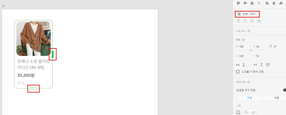 2. 그룹한 요소를 클릭 후 오른쪽 상단의 반복그리드를 클릭하게 되면 요소에 타원형이 요소 끝에 생긴다