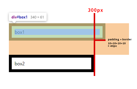 - box1, box2요소 둘다 width값이 300px인데 크기가 다르게 보임